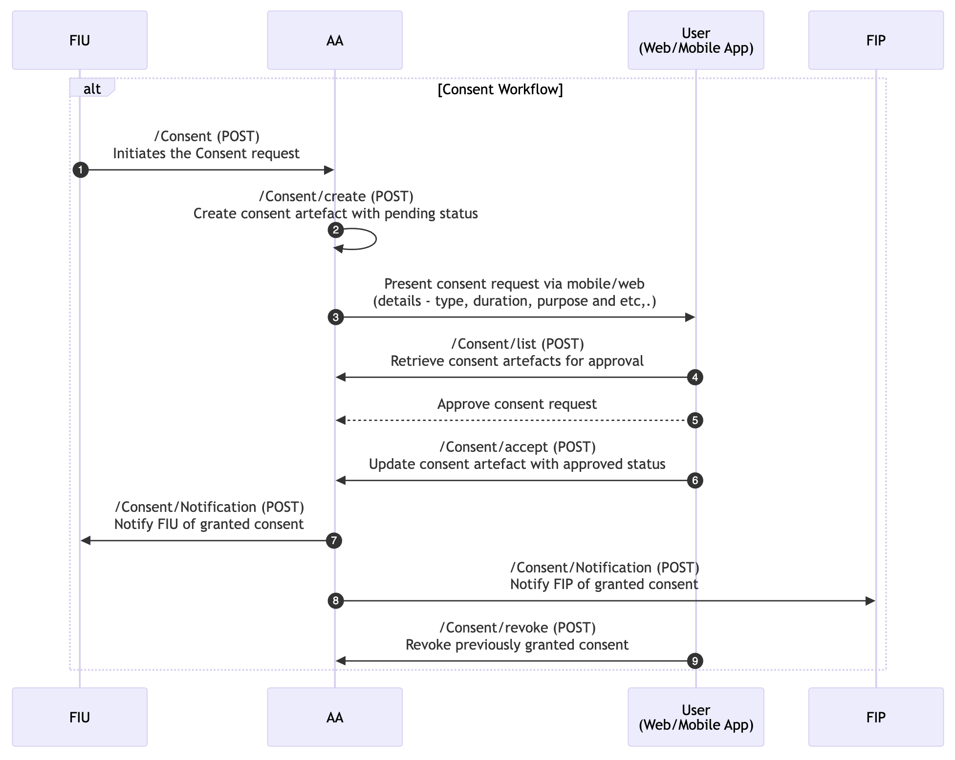 The consent workflow is a fundamental part of the Account Aggregator (AA) ecosystem. It ensures that Financial Information Users (FIUs) can access user data from Financial Information Providers (FIPs) only after obtaining explicit consent from the user. This workflow is governed by a series of secure and standardized interactions using the ReBIT APIs.