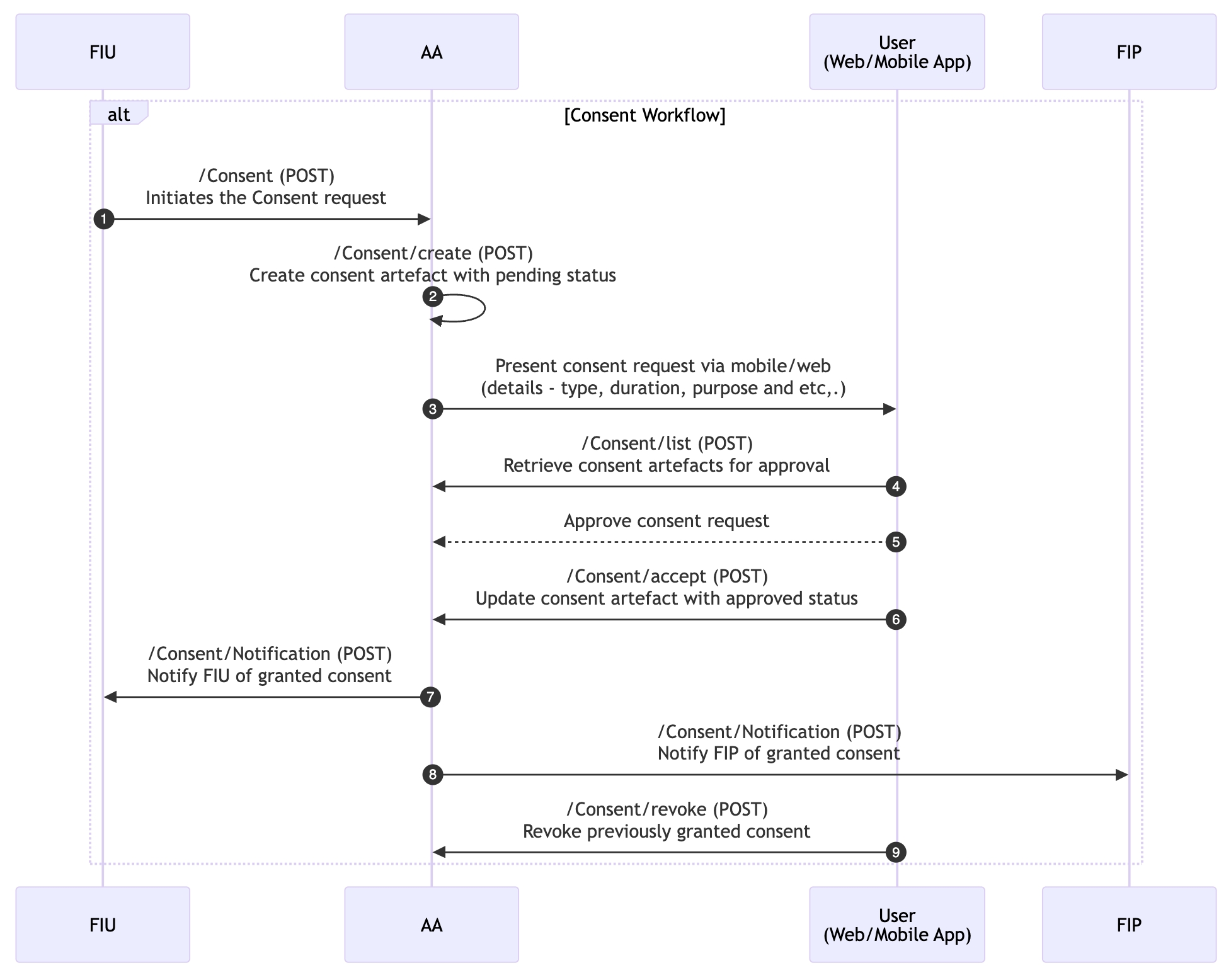 ReBIT API Involved (FIU 2.0.0 Spec): /Consent (POST): The FIU sends the consent request to the AA using this API. The request includes the data access requirements, purpose, and duration for which access is required.