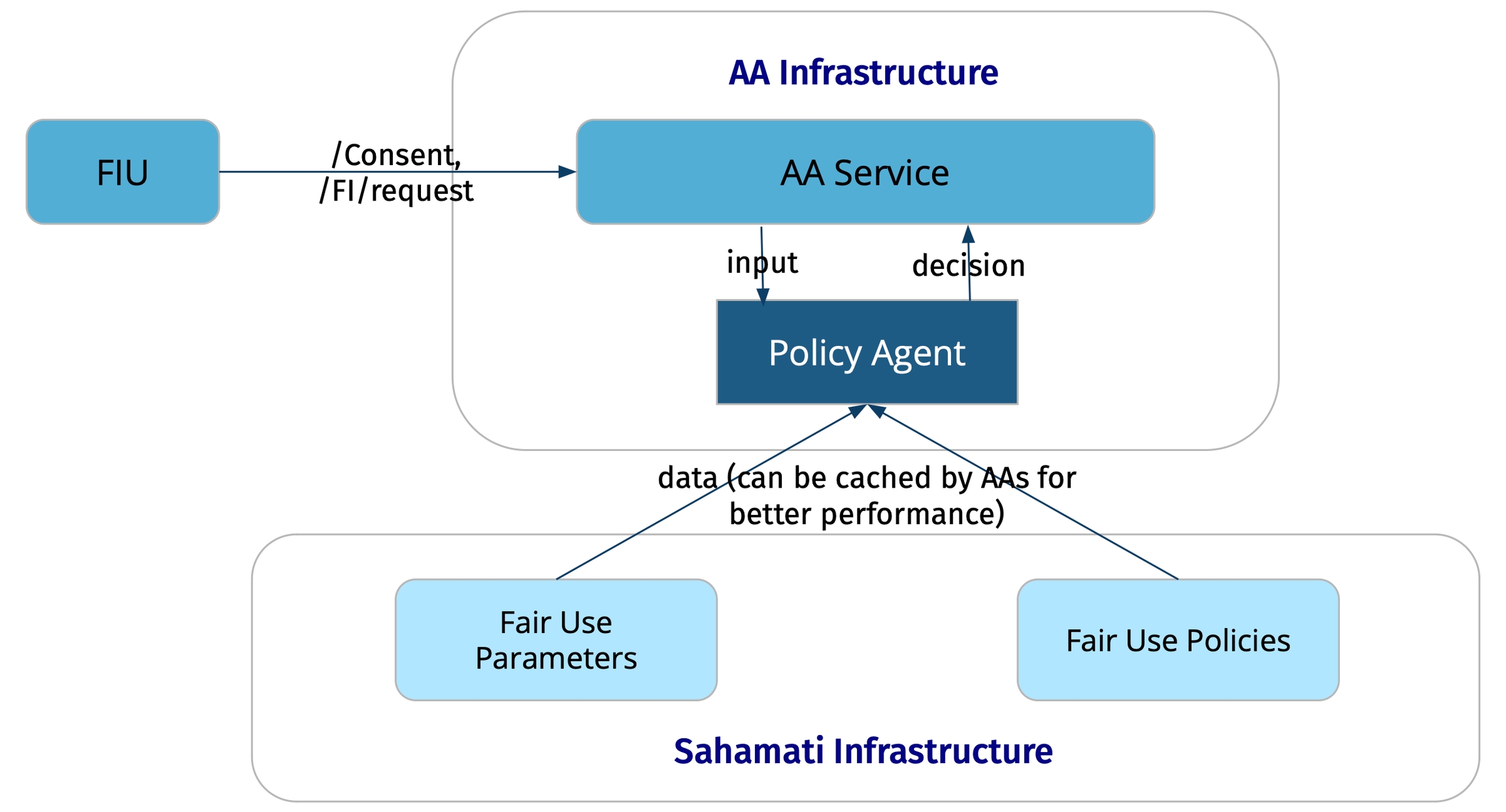 A policy-based automated framework that ensures compliance to fair use of consumer's consent and data in the AA ecosystem. AAs must enforce the Fair Use Policy for consent on all "Consent Request" and “FI Request” APIs.