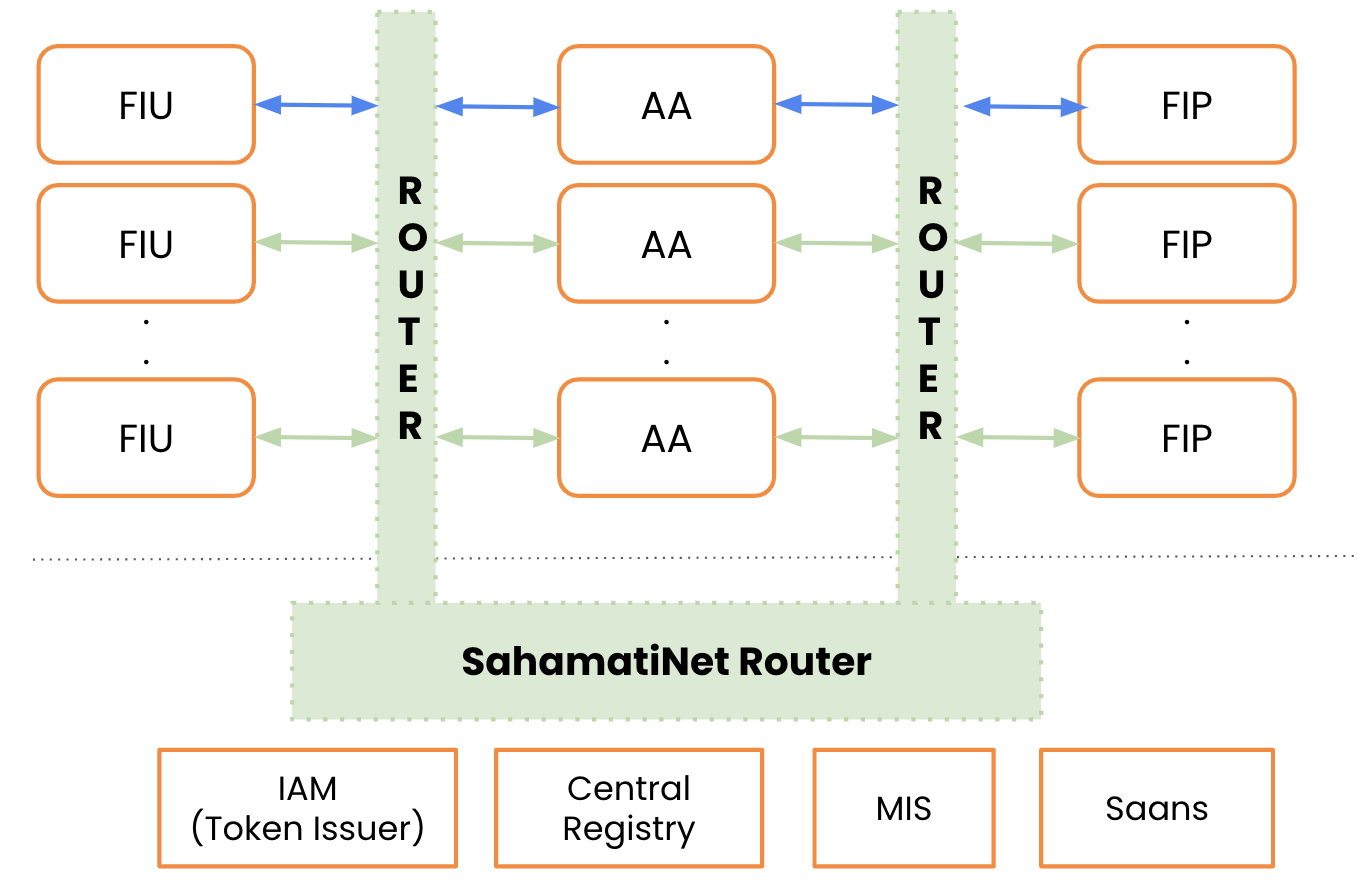 SahamatiNet serves as a central interface that **significantly enhances interoperability** within the AA ecosystem. It allows all participants—FIUs, AAs, and FIPs—to interact seamlessly by leveraging a unified set of shared protocols and standards defined by ReBIT. By integrating with SahamatiNet Router, each participant can effortlessly connect with and exchange data with other members of the ecosystem, **without needing to establish multiple individual integrations**. This centralised approach reduces complexity and eliminates the need for separate, technical connections, ensuring consistent data handling, security, and **simplified interoperability across all participants**.