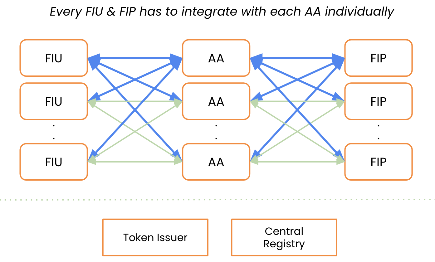 At present, the integration model within the Account Aggregator (AA) ecosystem involves multiple connections: